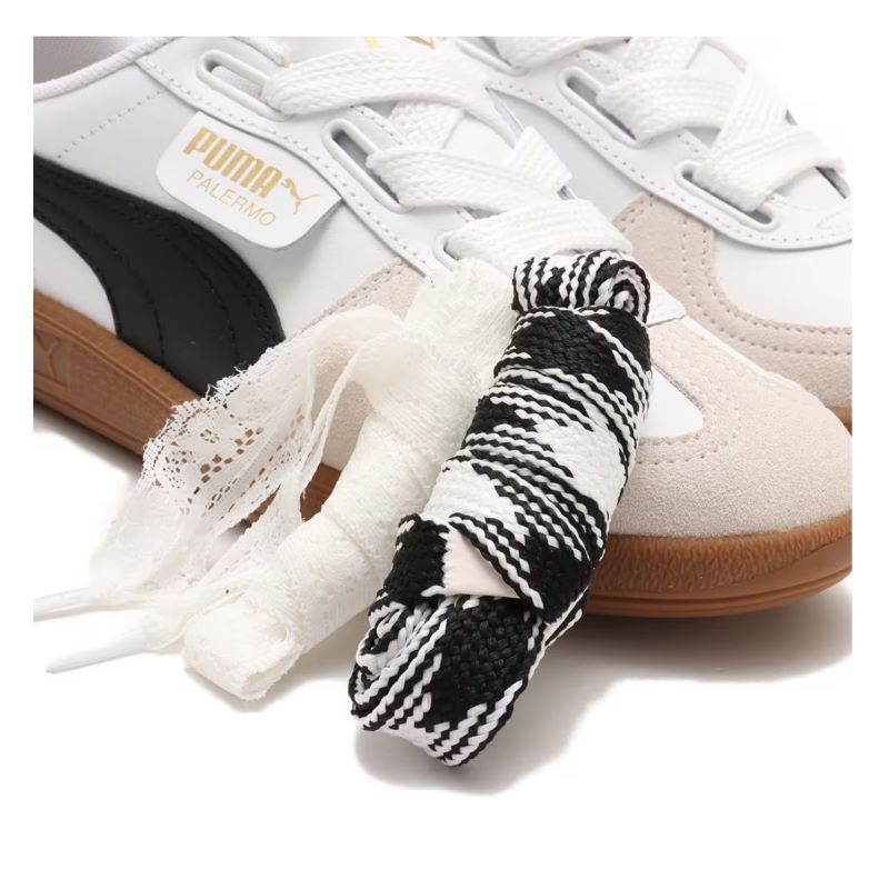 パレルモのシリーズよりワイドレースのスニーカーが登場。クラシカルなシューレースをXLリボンに変えてステートメント・ピースを演出。アッパーはレザー調、気分によってサテンとストライプの2種類のシューレースが使い分けられます!