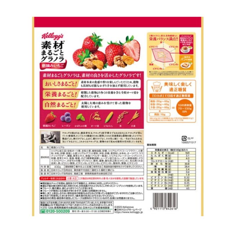 [3個]日本ケロッグ 素材まるごとグラノラ 朝摘みいちご 430g 賞味期限2026.04.30