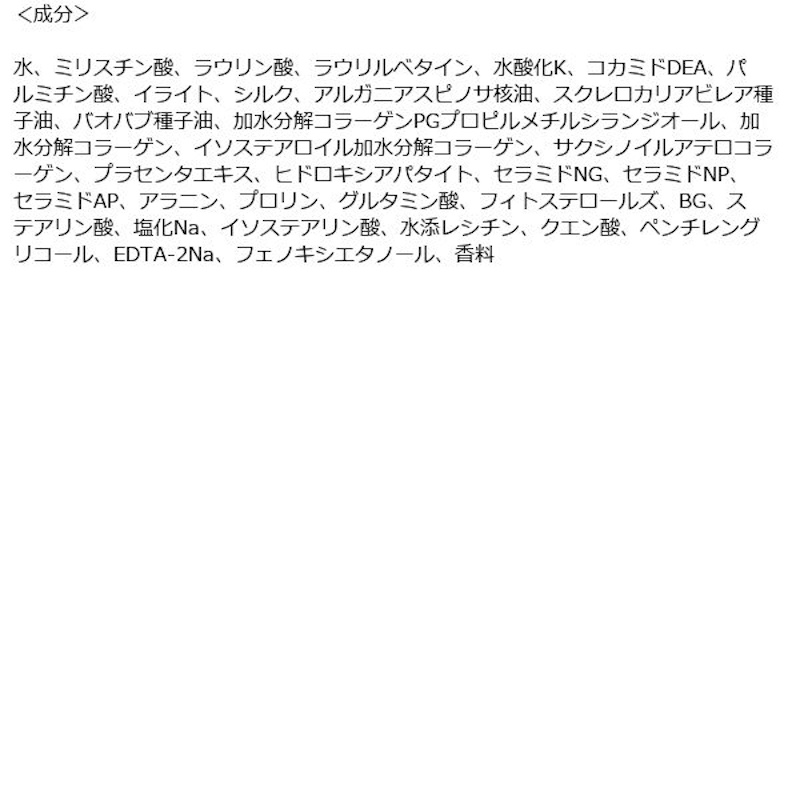 | 原材料 | 水、ミリスチン酸、ラウリン酸、ラウリルベタイン、水酸化K、コカミドDEA、パルミチン酸、イライト、シルク、アルガニアスピノサ核油、スクレロカリアビレア種子油、バオバブ種子油、加水分解コラーゲンPGプロピルメチルシランジオール、加水分解コラーゲン、イソステアロイル加水分解コラーゲン、サクシノイルアテロコラーゲン、プラセンタエキス、ヒドロキシアパタイト、セラミドNG、セラミドNP、セラミドAP、アラニン、プロリン、グルタミン酸、フィトステロールズ、BG、ステアリン酸、塩化Na、イソステアリン酸、水添レシチン、クエン酸、ペンチレングリコール、EDTA-2Na、フェノキシエタノール、香料 |